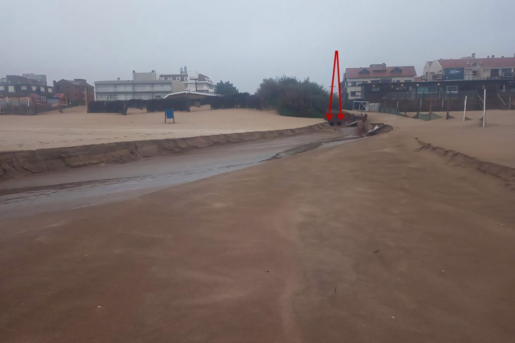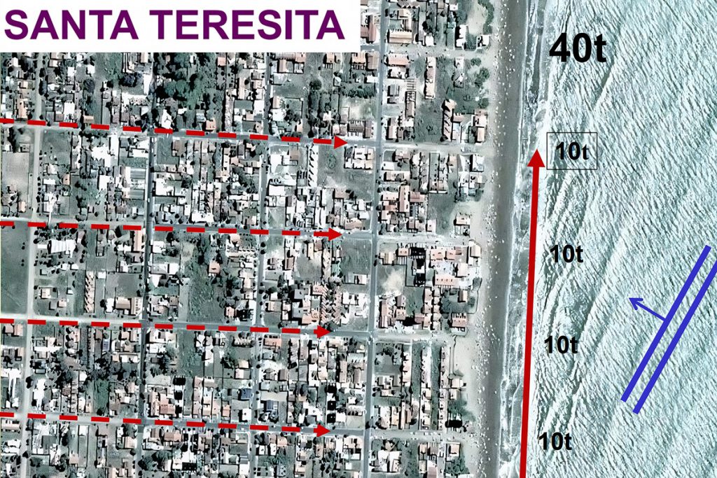 Este fenómeno contribuye a la erosión de la costa debido a la corriente de deriva (representada en la imagen por un vector rojo continuo), que actúa como una especie de cinta transportadora. Es decir que las 40t aportadas por las cuatro calles son evacuadas por la corriente de deriva generando una efectiva erosión costera de origen antrópico, jamás tenida en cuenta.